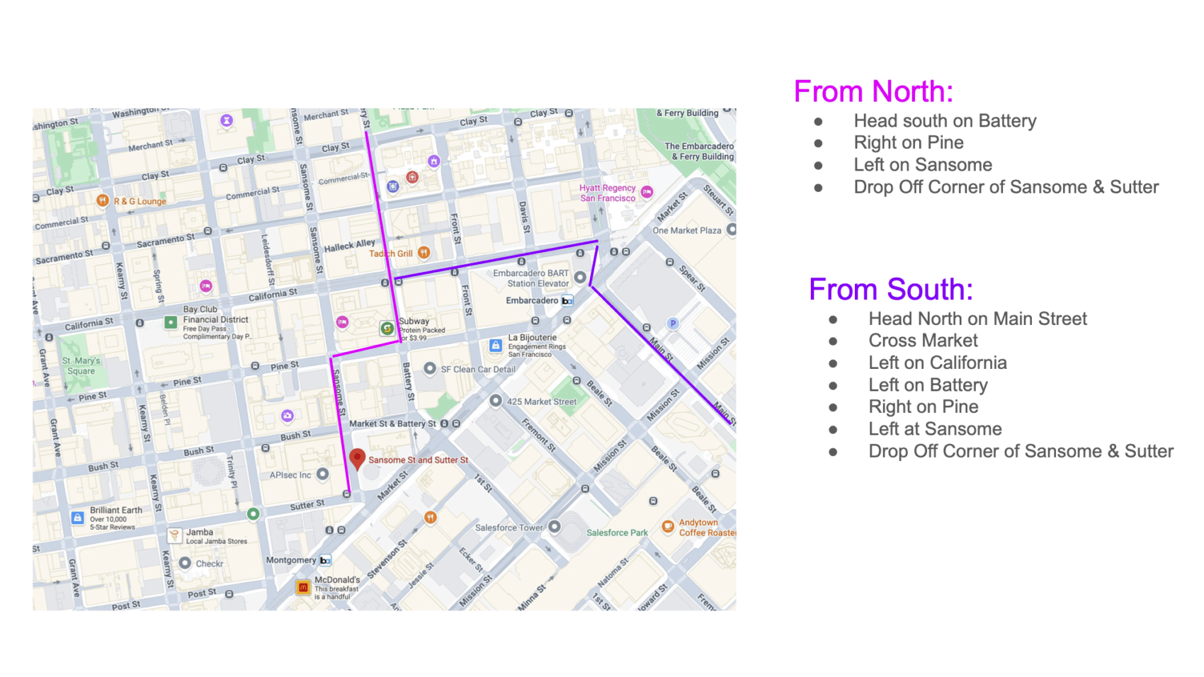 If you’ll be arriving via Uber or Lyft, please set your destination to Sutter St. and Sansome St as the address.