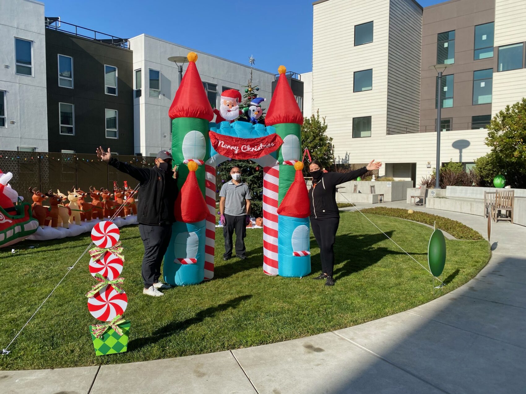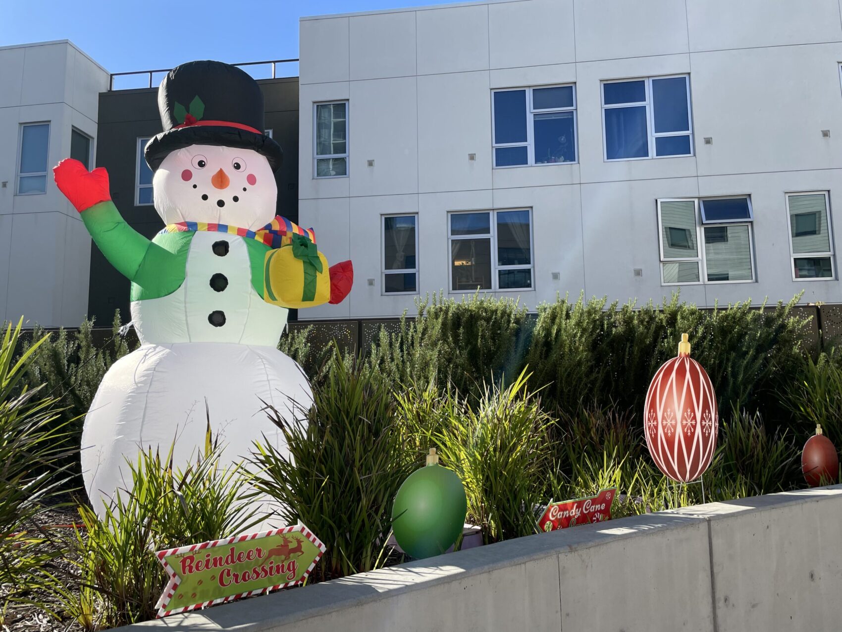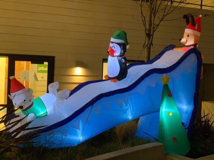 This year has thrown everyone for a loop but we are making sure families can enjoy the wonder of the holiday season safely and socially distanced. The entire 2nd floor courtyard at Family House San Francisco has been transformed into a beautiful and magical winter wonderland. When you arrive, you are immediately greeted by Frosty the Snowman and Sir Nutcracker each towering over 7ft tall. They light up and are so excited for you to enjoy the magic.